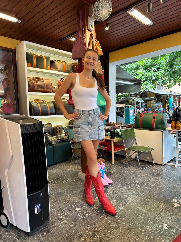 It didn’t take Jackie long after leaving the tailor to stumble across and run into a leather shop. Here she had cowboys boots custom made to her liking. And on the trip, Lincoln had broke his Birkenstocks so he decided to get a new pair custom made for 20$!!!